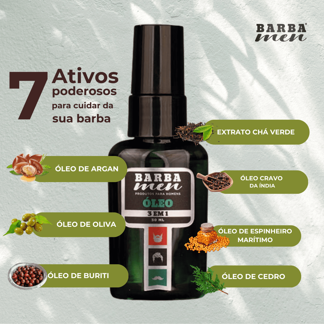 O ÓLEO PARA BARBA - 3 EM 1 - BARBA MEN - é considerado um dos melhores óleos para Barba e Bigode do mercado, desen...