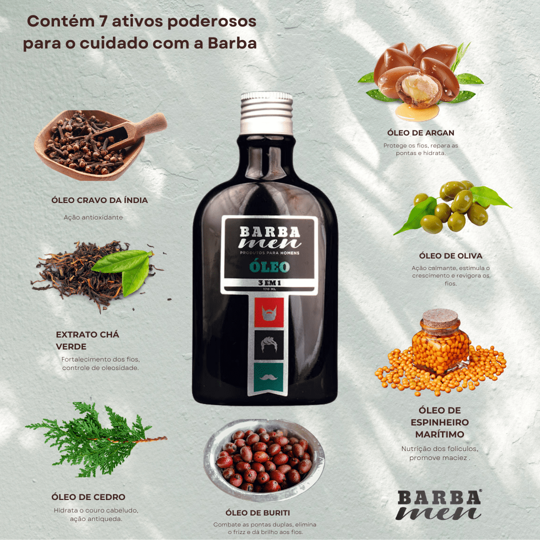 ÓLEO PARA BARBA - 3 EM 1 - é considerado um dos melhores óleos para Barba e Bigode do mercado, desenvolvido pela BARBA MEN, com um aroma exclusivo, matérias primas importadas e princípios ativos naturais altamente tecnológicos, incluindo NANOTECNOLOGIA. Ele promove maciez, hidratação, brilho, proteção e disciplina, além de eliminar o frizz e as pontas duplas.